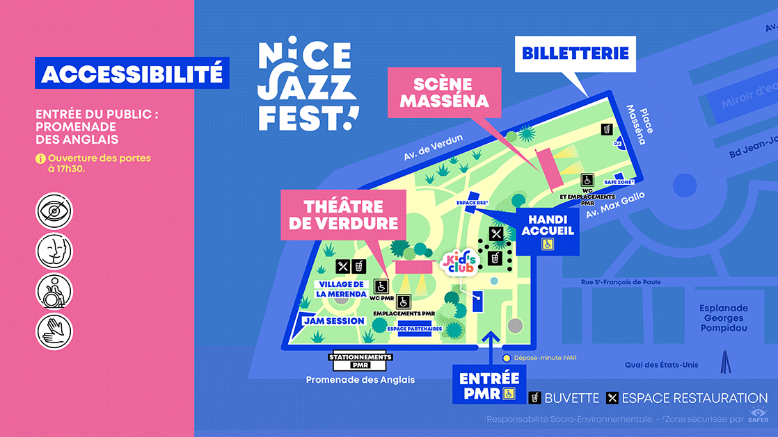 Pour les conducteurs munis de la carte CMI, des places réservées aux PMR pour le Nice Jazz Fest existent sur la Promenade des Anglais face au kiosque à musique.